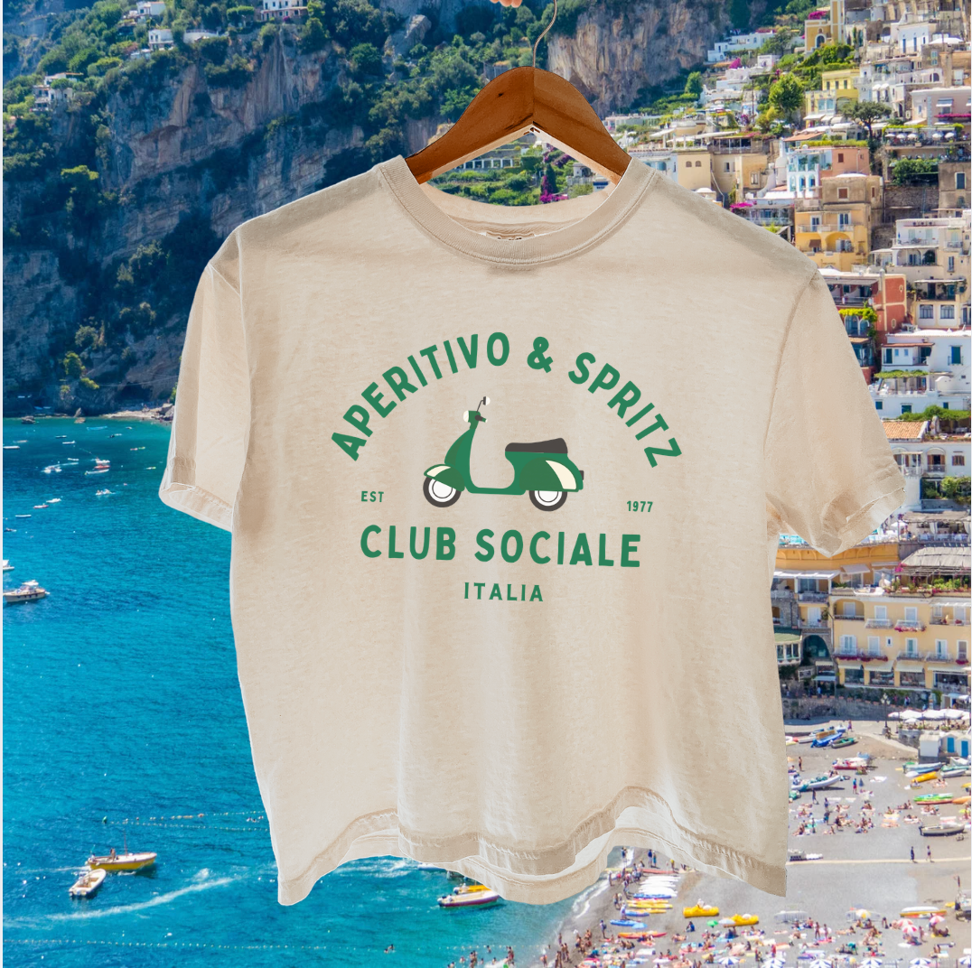 The Aperitivo & Spritz Club Sociale Tee captures the spirit of golden hour in Italy — Vespas parked along cobblestone streets, spritz in hand, nowhere to rush.