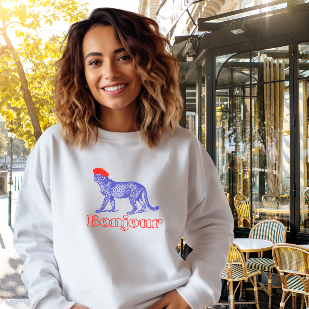 The Blue Bonjour Cheetah graphic, sporting a red beret, adds a unique and fun touch to this lightweight cotton sweatshirt, available in White and Chambray options. This sweatshirt exudes a playful and stylish vibe, perfect for casual outings or lounging at home. Ideal for individuals who appreciate quirky and trendy fashion choices.