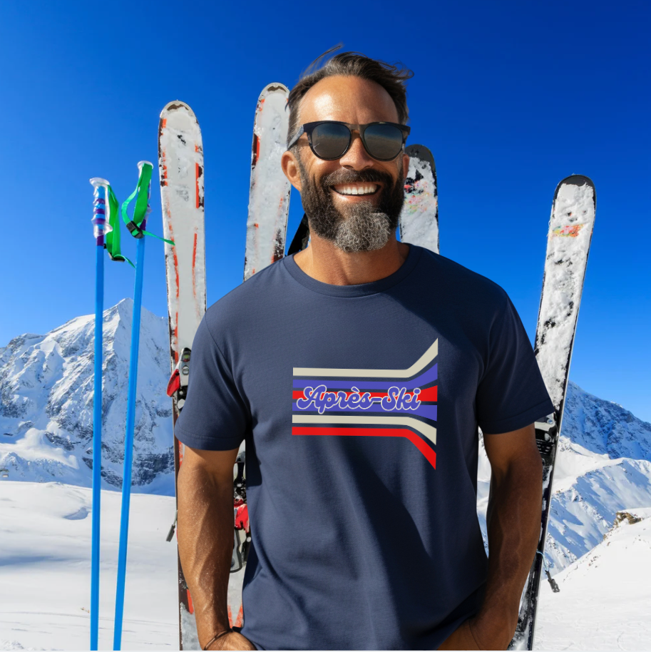 Classic 80's Retro Stripes and Après-Ski vibes give this tee everything you're looking for in your snowy layering essentials kit. Perfect for those who love a vintage aesthetic and enjoy winter sports. Ideal for winter layering fashion and cozy nights by the fire.