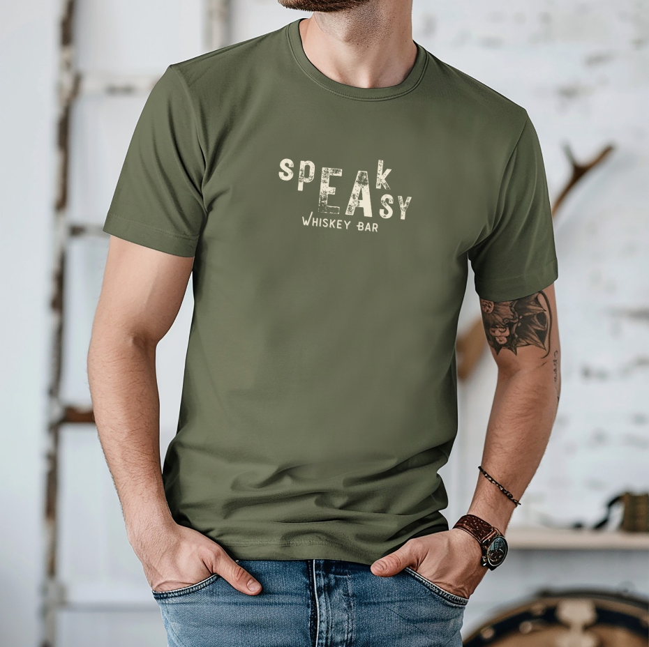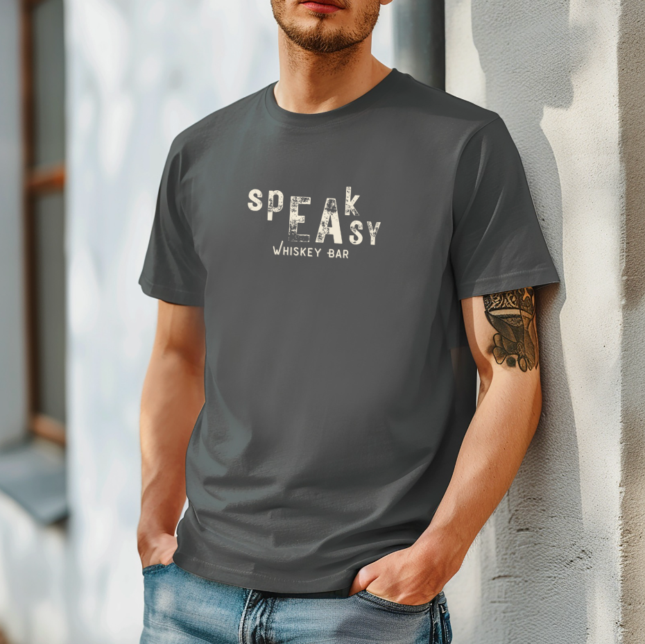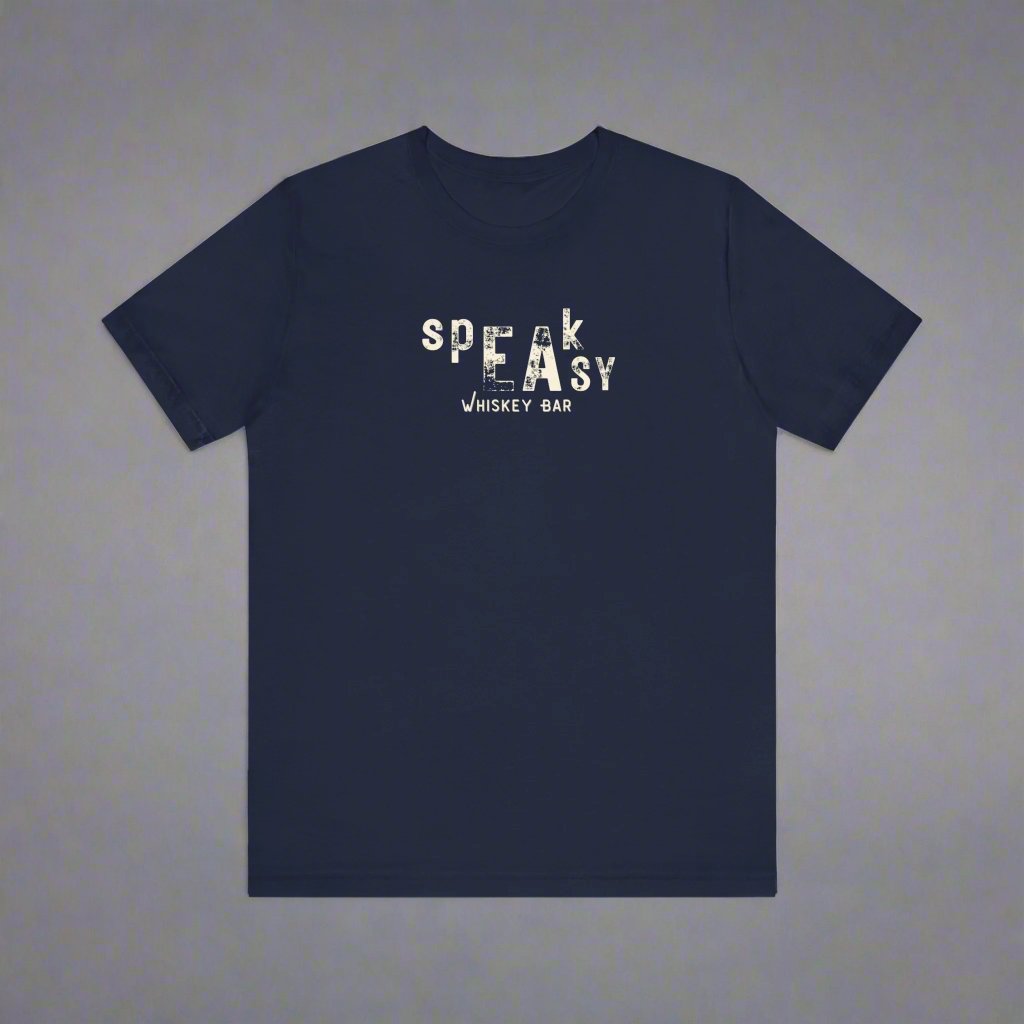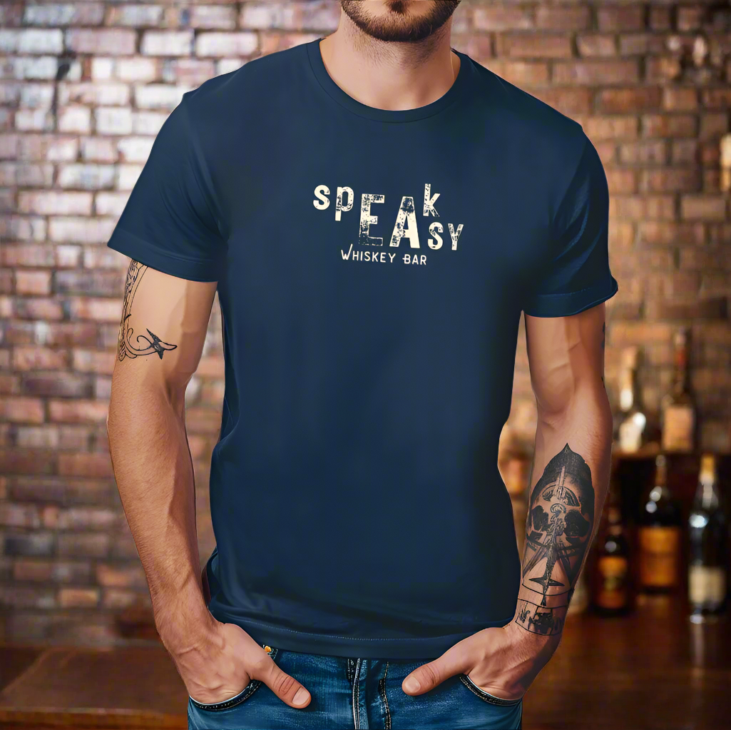 The Speakeasy Whiskey Bar Tee has a vintage appeal and is sublimely soft. Perfect holiday gift for the men in your life that love a good Whiskey and the allure of the Speakeasy.