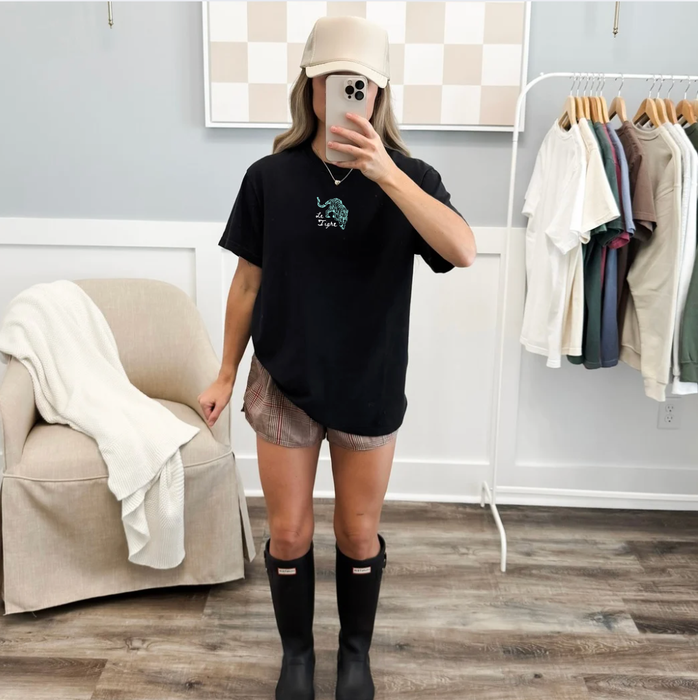 A relaxed, garment-dyed tee with a soft, lived-in feel and a small, hand-drawn tiger illustration centered on the chest. The heavyweight cotton and tubular knit give it structure while the post-construction dye creates a vintage, broken-in color and texture that deepens with wear. Wear it on slow mornings, road trips, or quiet evenings at a local café — it layers easily under a flannel or stands alone as a subtle statement piece for people who favor understated art and nature-inspired motifs.