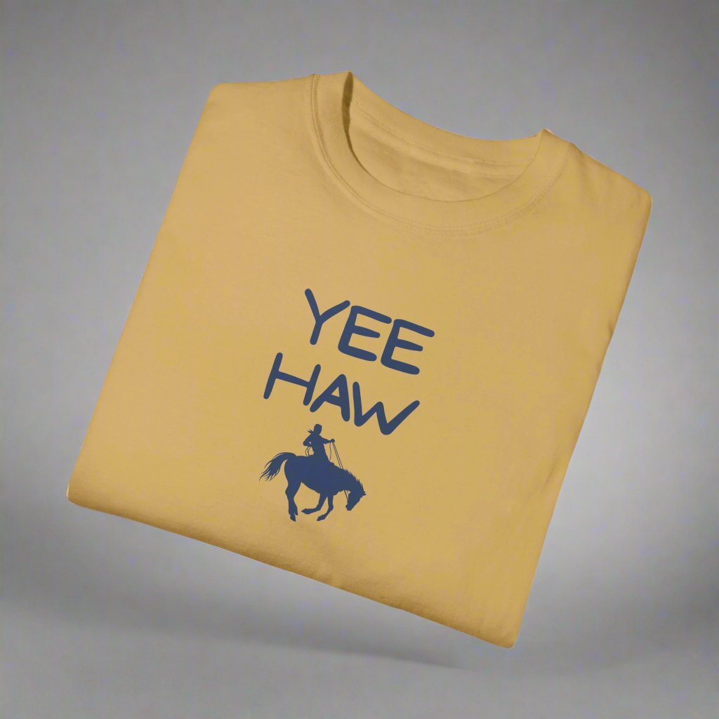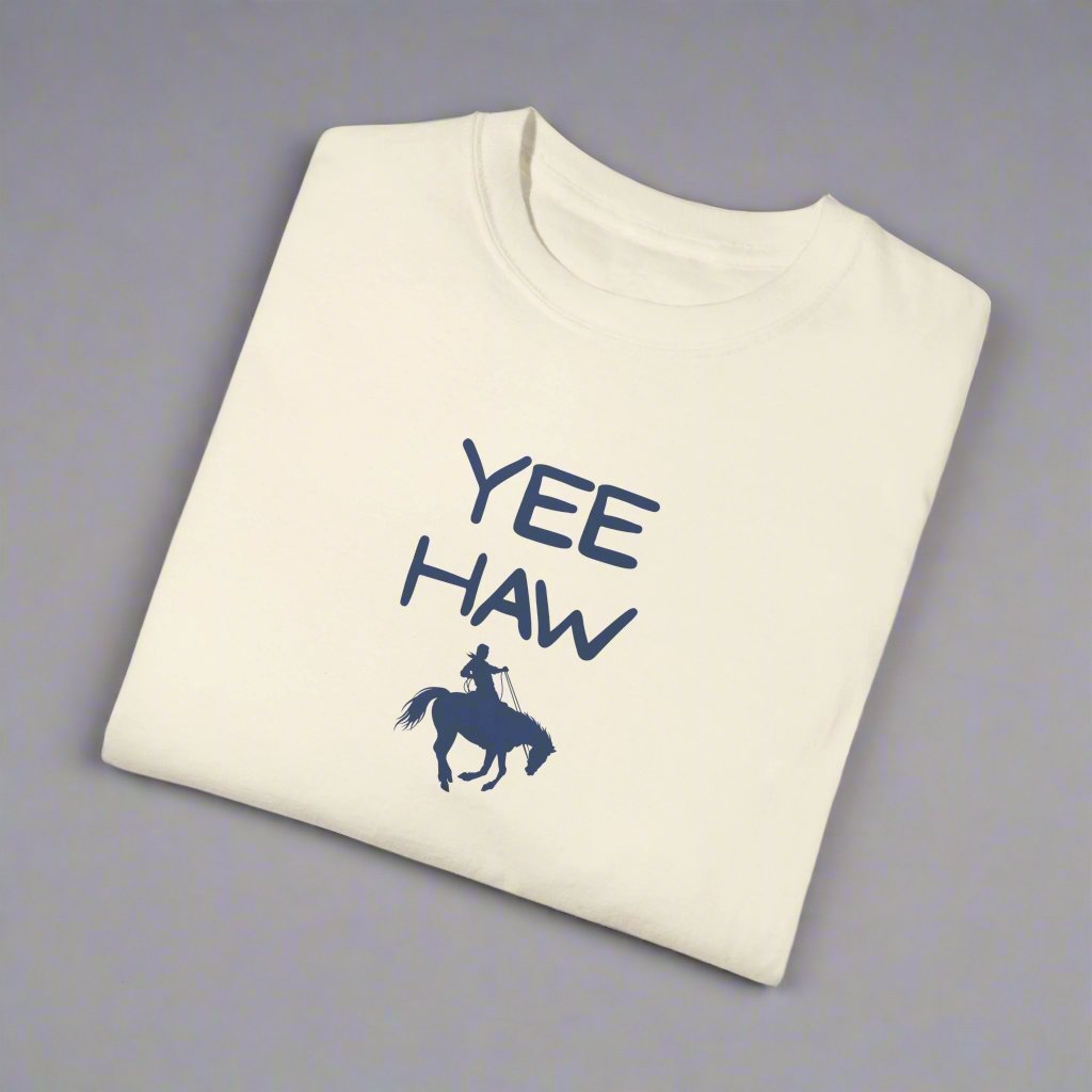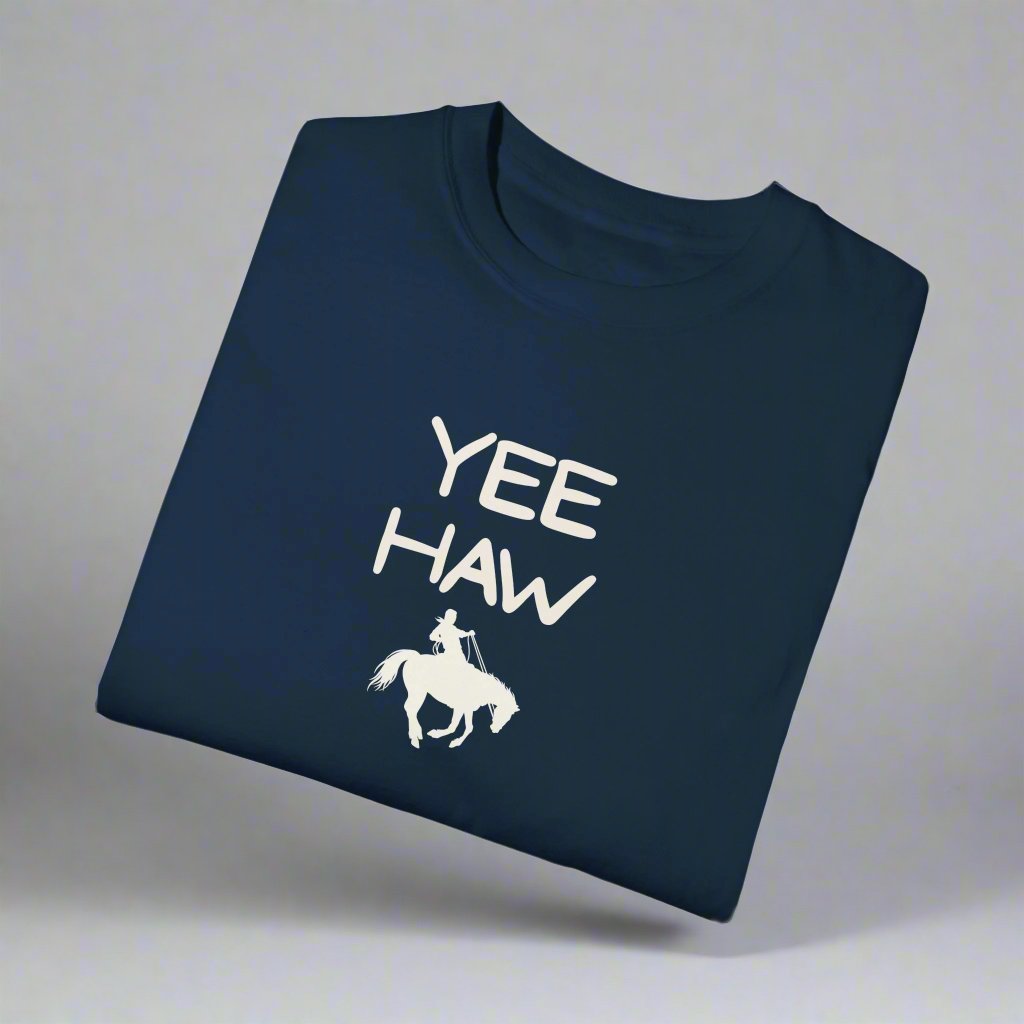 Saddle up with this Yee Haw Bucking Bronco Tee. This Unisex garment-dyed tee can be worn with the perfect Jeans and boots, or popped under a blazer to bring some western flair to work. The Relaxed fit of the Tee can be styled true to size, or worn oversized.