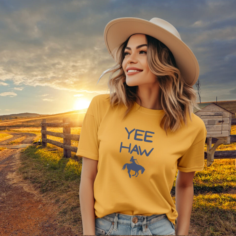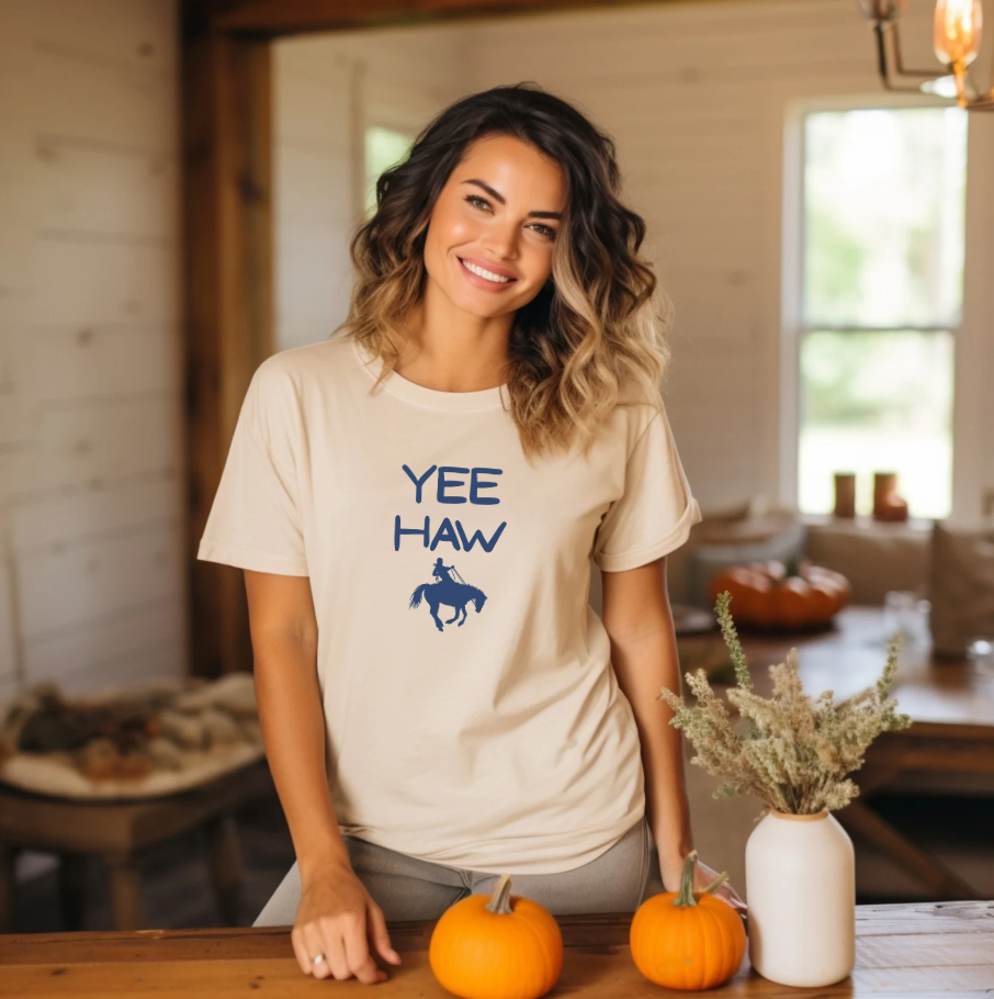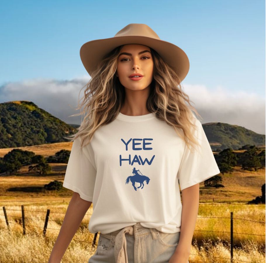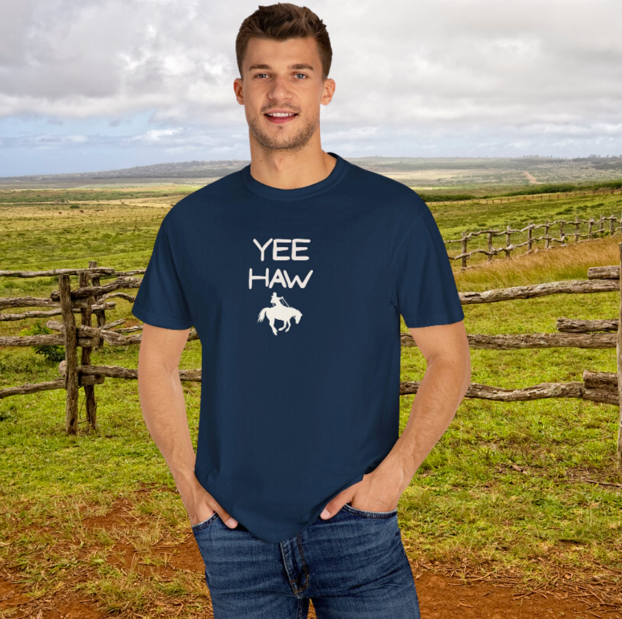 Saddle up with this Yee Haw Bucking Bronco Tee. This Unisex garment-dyed tee can be worn with the perfect Jeans and boots, or popped under a blazer to bring some western flair to work. The Relaxed fit of the Tee can be styled true to size, or worn oversized.